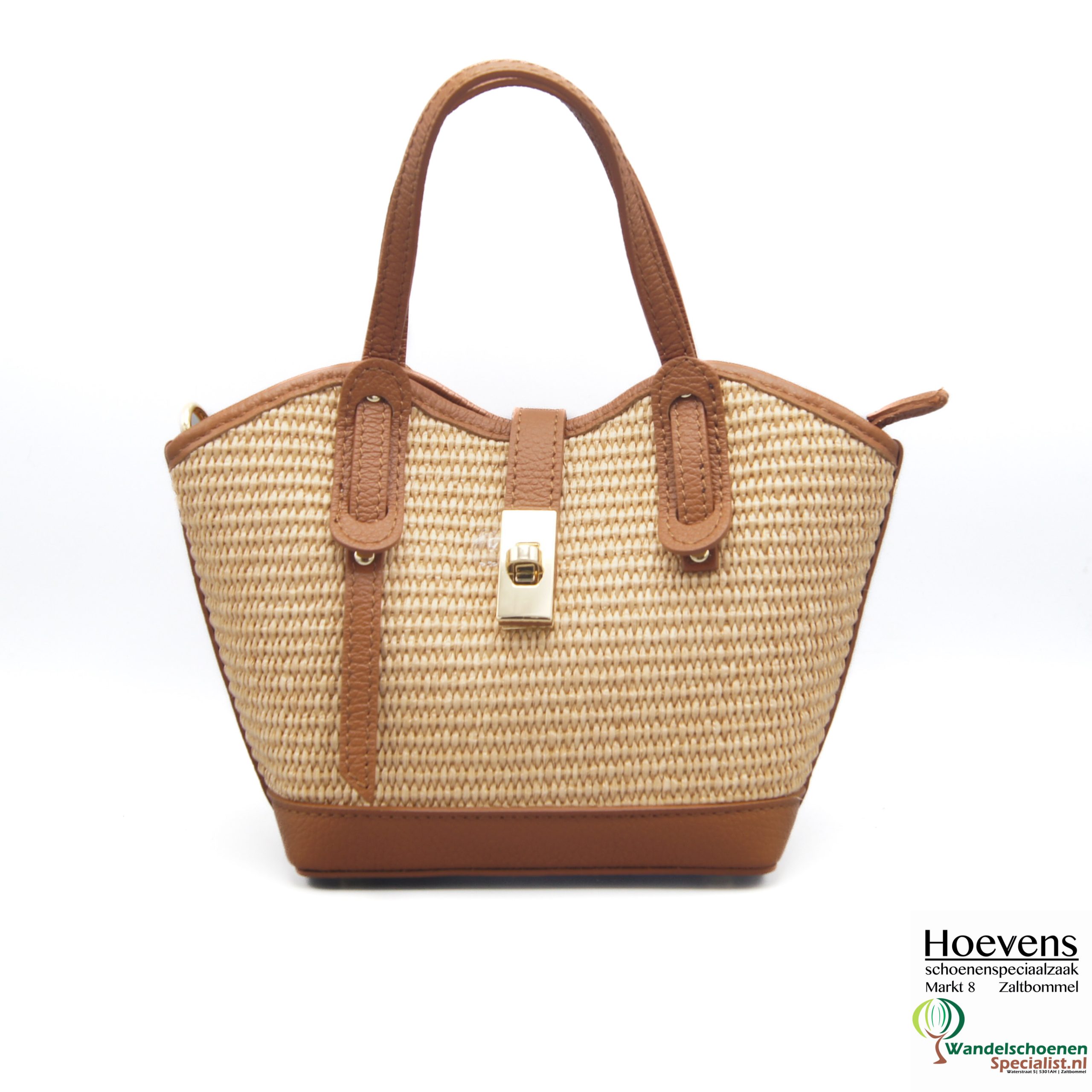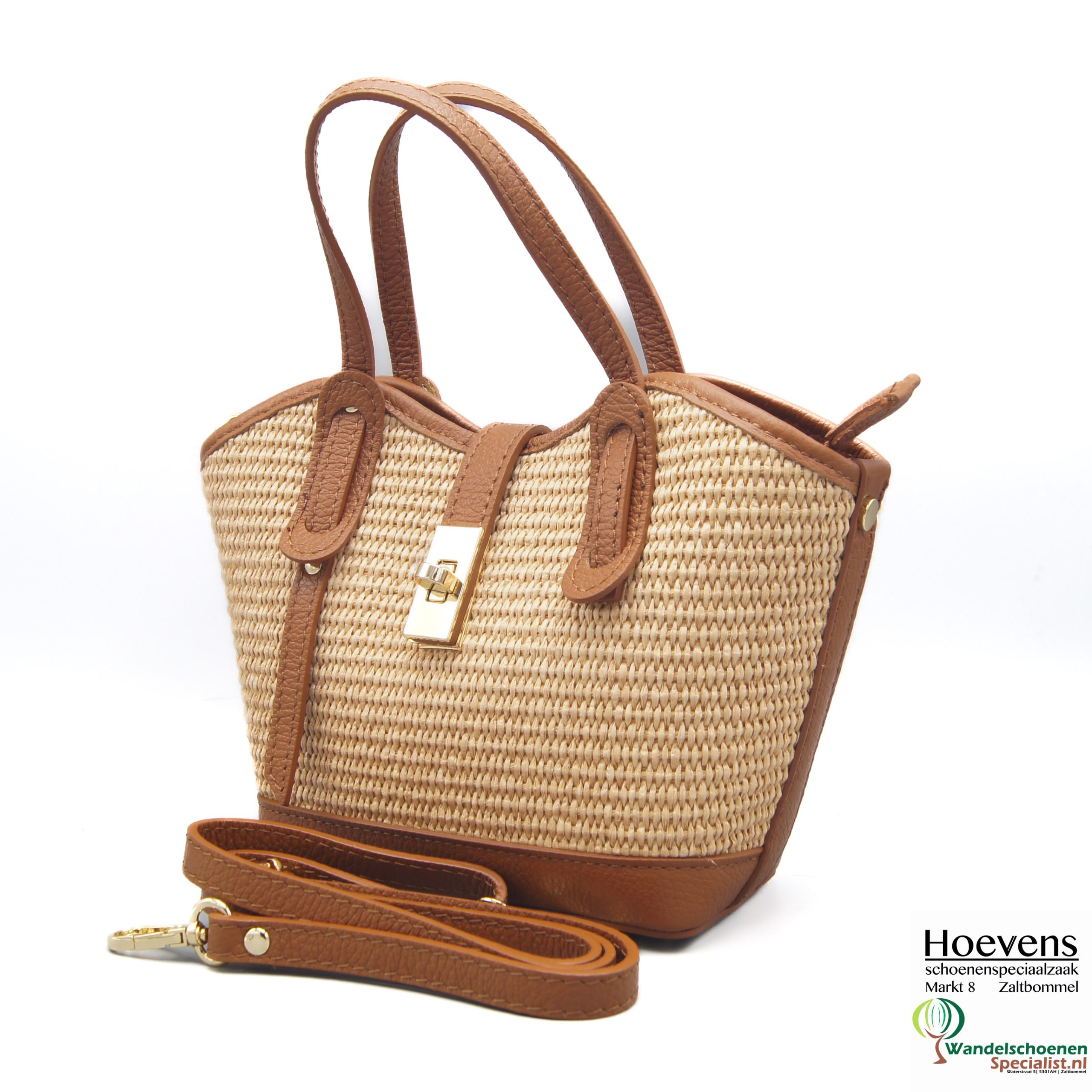 Leuke kleine handtas van riet met een leren bies en leren sluiting. Inclusief bijpassende schouderriem.