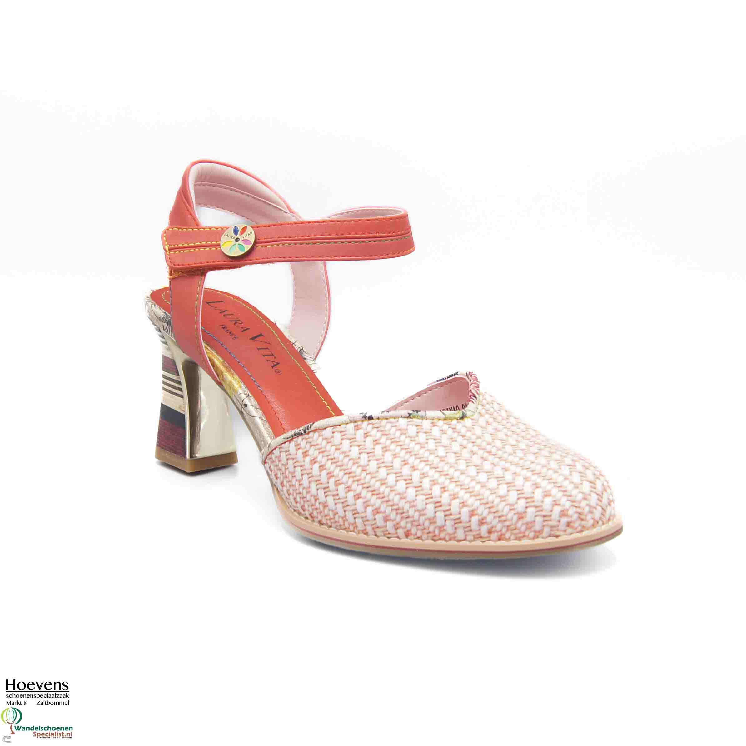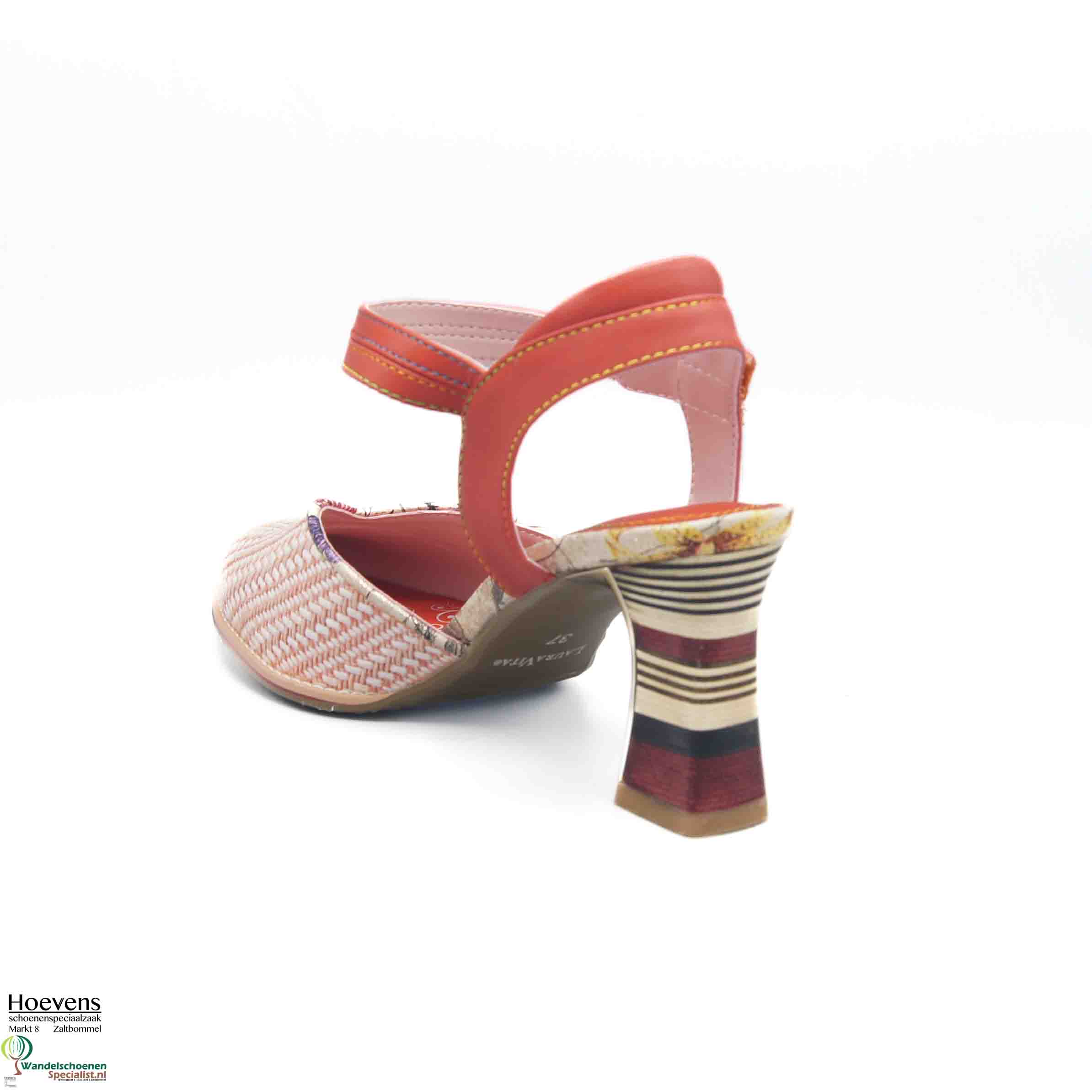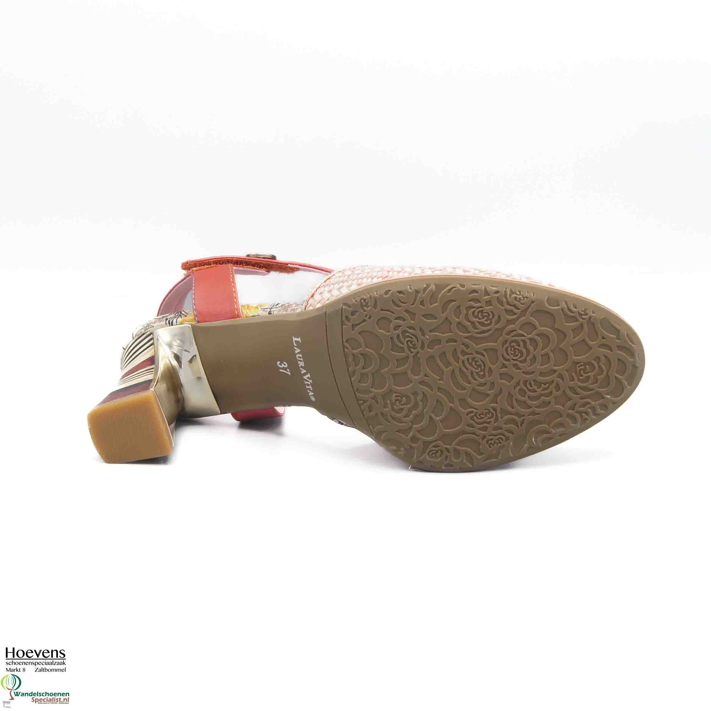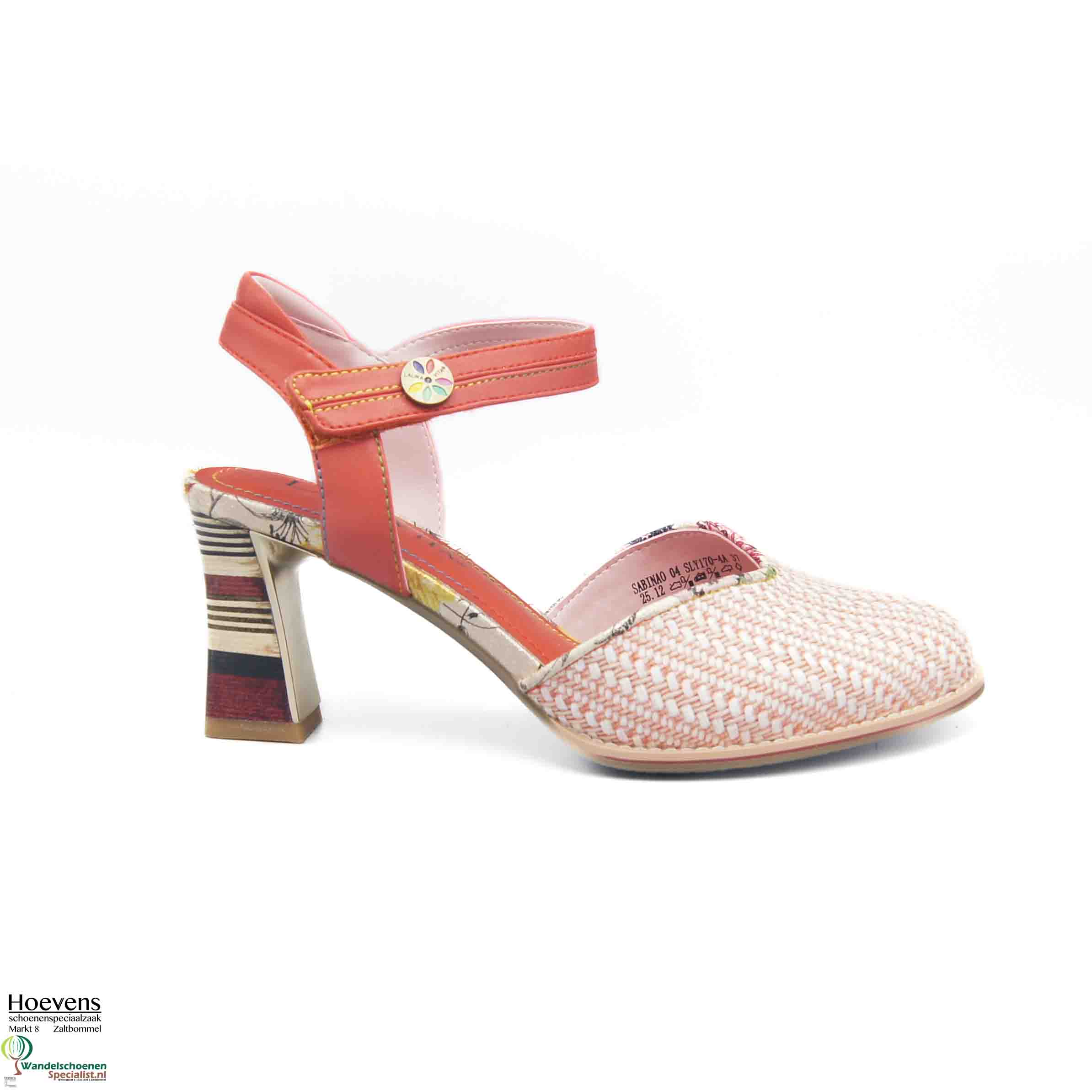 De Sabinao 04 is een vrolijke sandaal met dichte neus en eigenwijze gestreepte blokhak (6cm). Bandje achter de hiel en een verstekbare sluiting om de enkel met klittenband. Uitgevoerd groen met blaadjesmotief en zilveren accenten. Zacht en comfortabel voetbed.